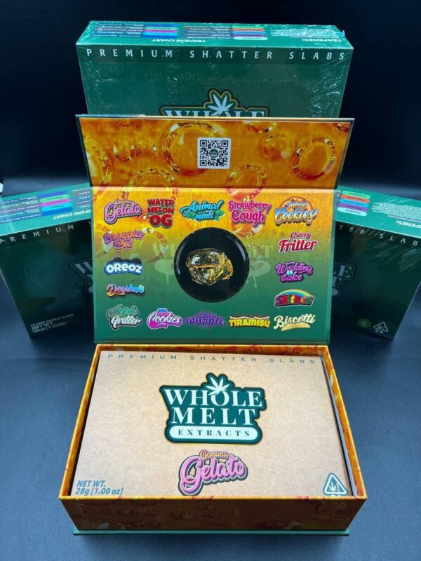 Whole Melt Banana Gelato is a potent live resin shatter (Strawberry Banana x Bubblegum) known for its rich flavor and aroma. Provides appetite/mood enhancement, pain/nausea relief, euphoria, and boosts creativity/focus. Buy authentic from licensed dispensaries or our official website.